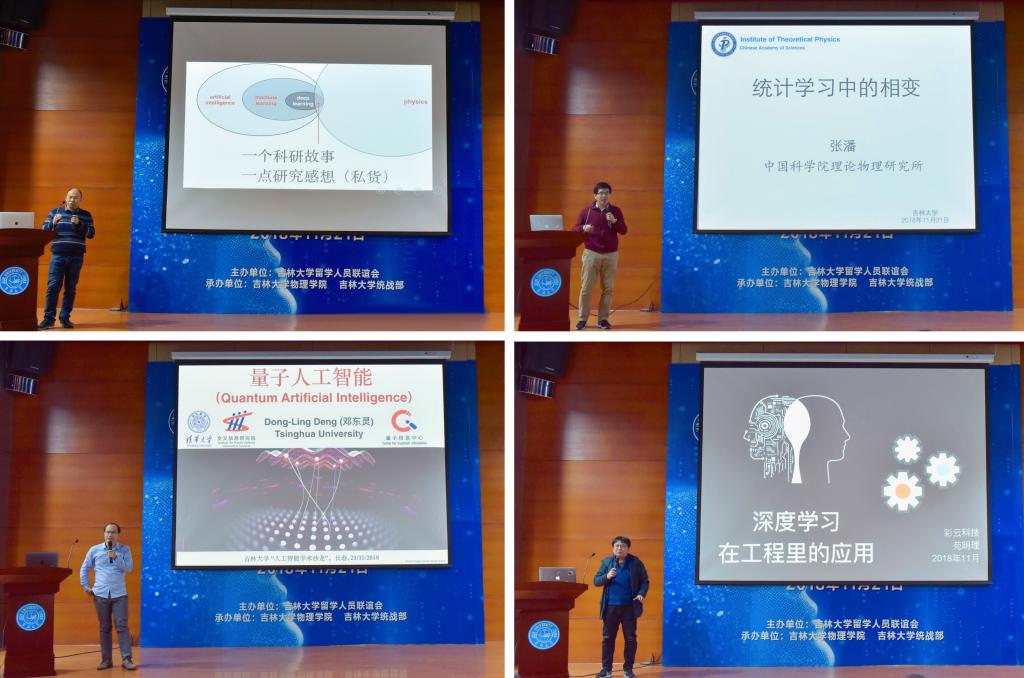 随后,四位嘉宾分别作了主旨演讲。中科院物理研究所王磊博士以深度学习的数学与物理为题,漫谈数学家与物理学家眼中的深度学习,结合个人的研究体会,谈对于深层神经网络理解的三重境界;中科院理论物理研究所张潘博士就统计学习中的相变介绍自然界如何做计算,以及人工智能与物理科学是否存在着统一的方法论;清华大学邓东灵博士从量子人工智能方面介绍了量子计算机如何加速解决人工智能问题,以及如何应用人工智能解决复杂的量子问题;彩云科技有限公司CTO苑明理着眼于例子看深度学习解传统问题方面,通过人工智能在天气预报、消除雷达噪音、预测海洋温度变化等方面的应用,漫谈深度学习如何解决传统的应用性问题。