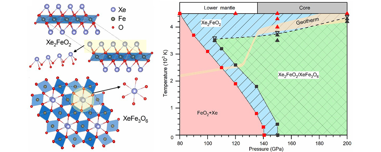 本研究利用马琰铭教授团队自主研发的CALYPSO结构预测方法(),首次预言了下地幔中存在氙气储存库,指出氙可与近期发现的下地幔矿物FeO2发生化学反应,生成稳定的氙铁氧化物—Xe2FeO2和XeFe3O6。下地幔密度和声速等关键数据的实验和理论对比显示,氙铁氧化物是可行的下地幔成分。系统的结构预测和热力学计算表明,FeO2不会与氩、氪和氖等其它惰性气体发生化学反应,并且下地幔的其它主要成分FeO、MgO、SiO2、CaO和Al2O3等氧化物也不能与氙气发生化学反应。如上数据证实了FeO2具有俘获氙的能力,也显示了氙可能是唯一以化合物形式存在于下地幔的惰性元素。该工作拓宽了氙化学的研究范围,丰富了下地幔的物质构成,表明了下地幔是氙气的理想藏身之所,为阐明“氙气消失之谜”提供了新的关键材料成分和物理机制。