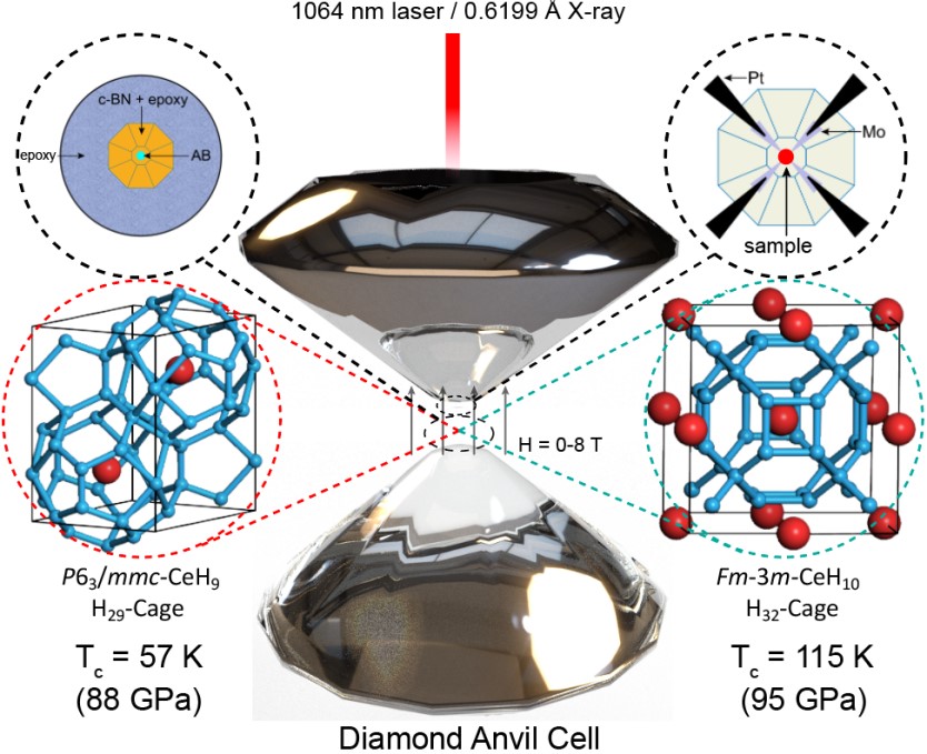 图:原位高压电学测量实验截获两种高温超导体CeH9和CeH10