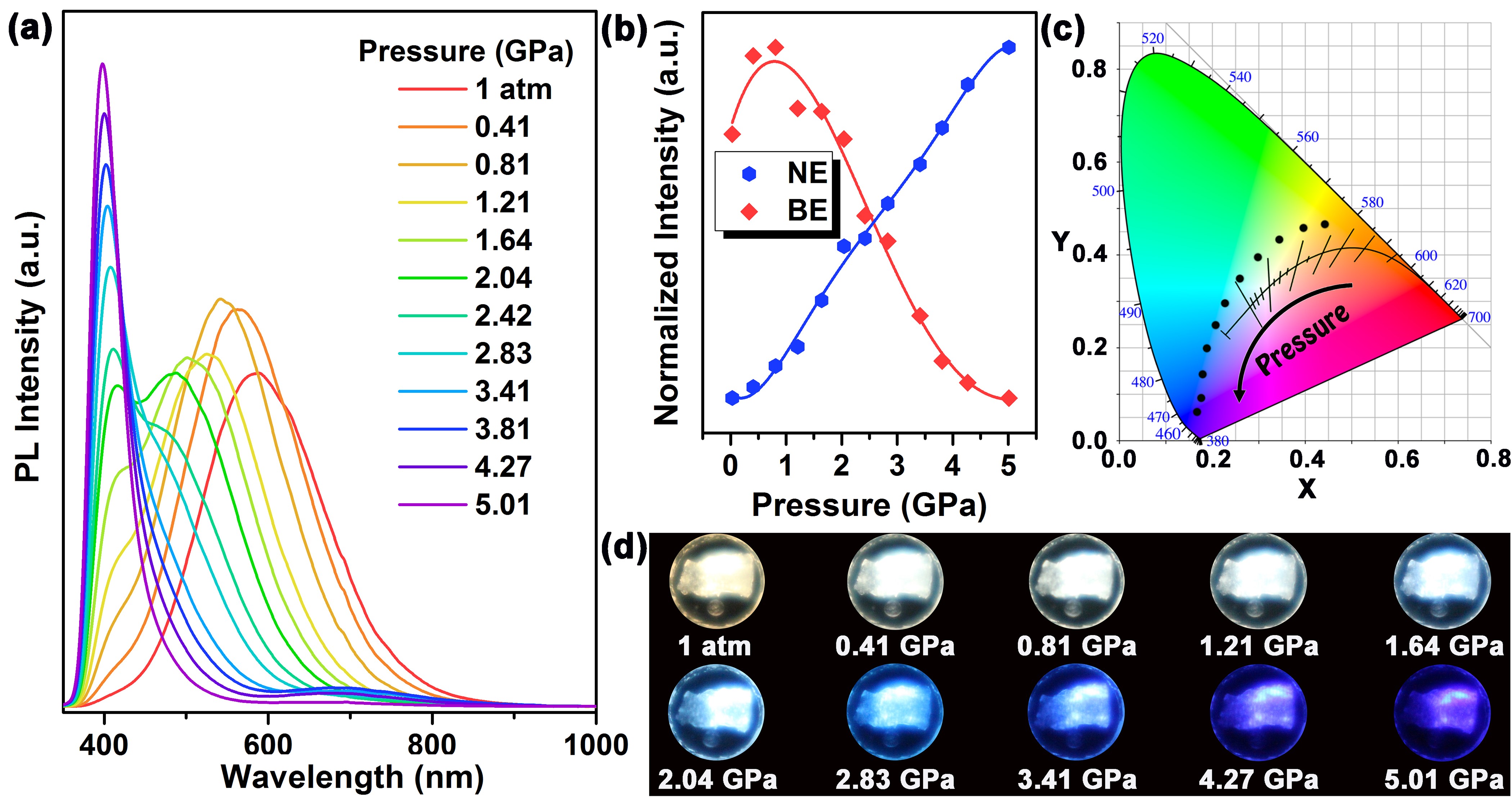图1. (a) 压力诱导反系间穿越促使NE辐射增强的原位光谱演变;(b) NE和BE归一化荧光强度随压力的变化曲线;(c, d) 不同压力下发光对应的色标色温图以及发光照片。