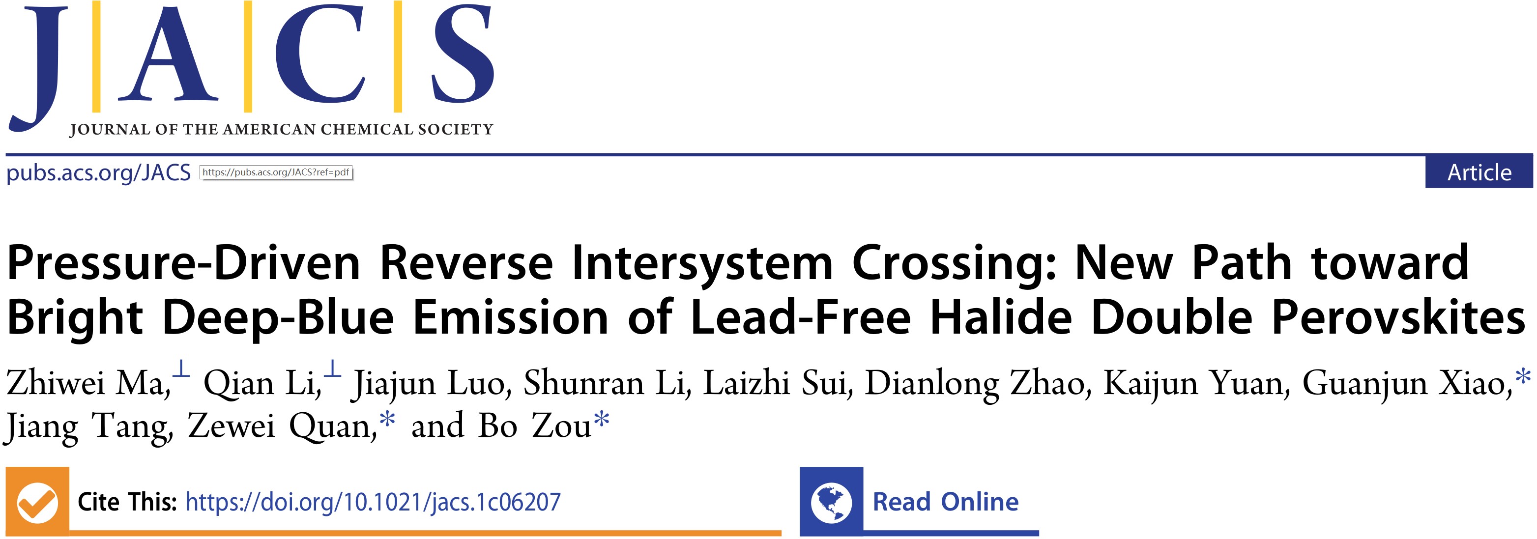 相关工作以“Pressure-Driven Reverse Intersystem Crossing: New Path towards Bright Deep-Blue Emission of Lead-Free Halide Double Perovskites”为题,发表在Journal of the American Chemical Society (DOI: 10.1021/jacs.1c06207)上。麻豆tv