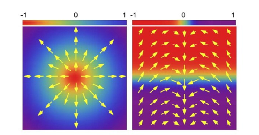 磁斯格明子(左图)和磁畴壁斯格明子(右图)二维平面投影图。箭头标记和颜色分别代表自选在XY和Z方向的取值,可以看出两种斯格明子自旋的缠绕结构不同。