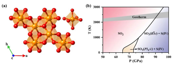 前期研究发现,一些简单分子体系(如CO, CH4, NO 和H2S等)在高温高压下会发生歧化反应,SO2是否也会存在类似的行为呢?马琰铭教授研究团队利用自主研发的CALYPSO晶体结构预测方法,预言了稳定的SO3结构【图一(a)】,发现在高压下SO3是S-O化合物最稳定的存在形式。进一步的第一性原理计算表明SO2在高温高压下也会发生歧化反应,形成SO3和S单质。
