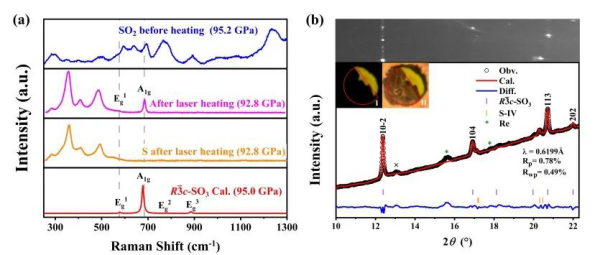 为了验证理论预言,团队采用激光加热的DAC实验对SO2高温高压行为开展了研究。通过拉曼和XRD测量证实了在高温高压下SO2的确发生歧化反应,形成了SO3和S单质(图二)。该研究重构了SO2的温压相图,表明常压稳定存在的SO2在高温高压下将不再稳定。研究工作为理解地幔内部的S循环提供了新途径。