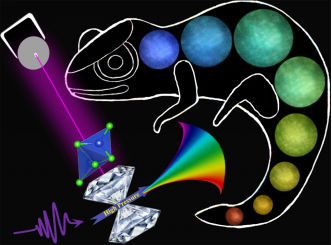 压致变色材料是一类可以根据外界刺激改变其发光颜色的智能材料,在防伪、光电存储和压力传感等领域具有广阔的应用前景。目前报道的关于压致变色材料大多数局限于全有机或含有机组分杂化的材料,如金属有机框架或有机-无机杂化卤化物等,并且在可见光区域的压致变色范围限制在100 nm以内。此外,有机组分具有较低的热力学稳定性,极大地阻碍了其压致变色方面的实际应用。全无机纳米材料由于其较高的稳定性以及优异的光学性能,在显示和照明器件中得到了广泛的应用。然而关于全无机纳米材料压致变色行为的研究仍然存在两个障碍:首先,在外部压力作用下,大多数无机纳米材料存在压力诱导发光猝灭的问题;其次,荧光可调谐波长范围有限,由于量子限域效应和结构刚性等因素致使发光波长局限于高能辐射态。因此,如何在全无机纳米材料中实现稳定且可见光宽光谱范围的压致变色的精细调控,长久以来一直是发光材料领域的关键科学问题之一。