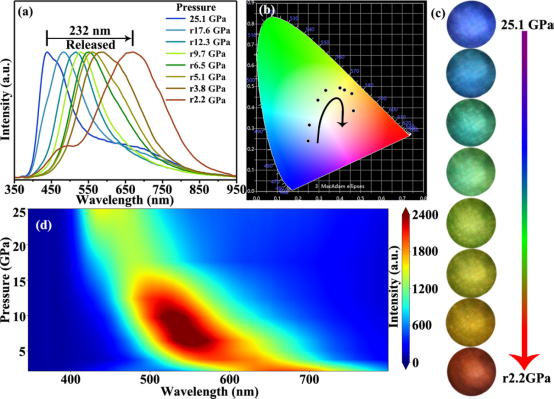 该工作大幅拓宽了压致变色发光材料在可见光区的响应范围,为服役于极端压强条件下的设备安全及压力泄漏防护,提供了一种相对稳定且裸眼可视化的全无机压力监测和传感材料。