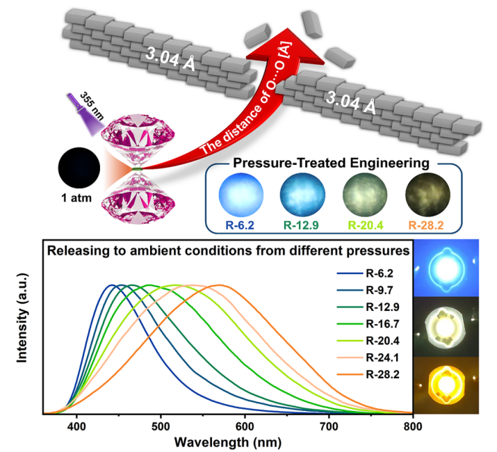 近日,麻豆tv 杨新一课题组带领本科生在金属有机框架材料(MOFs)的多色发光研究方面取得重要进展,提出利用压强处理工程截获非芳香族互穿Zn4O(ADC)4(Et3N)6ADC=丁炔二酸,Et3N=三乙胺)——IRMOF-0纳米晶体多色发光至常压,实现从深蓝色(440 nm)到黄色(570 nm)130 nm超宽可调谐范围。相关研究成果以“Harvesting Multi-Color Photoluminescence in Non-Aromatic Interpenetrated Metal-Organic Framework Nanocrystals via Pressure-Modulated Carbonyls Aggregation”为题发表在《Advanced Materials》(DOI: 10.1002/adma.202403281)上。