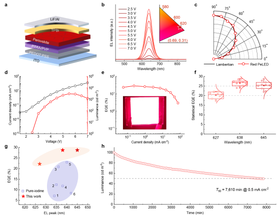 图2. 纯红光PeLEDs的器件性能。©2024 Springer Nature