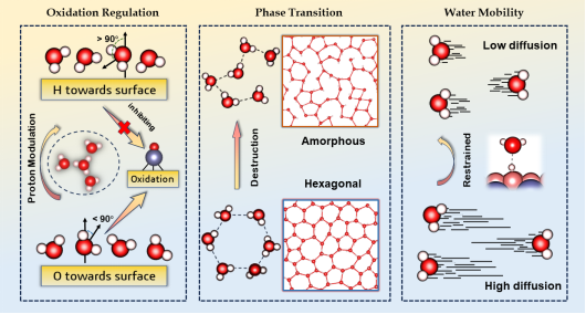 本工作中,孟醒副教授研究团队在前期已开展的MXenes-H2O体系氧化行为研究成果(Angew. Chem. Int. Ed. 2023, 62, e202304205)基础上,进一步深入研究,采用深度神经网络算法和主动学习策略拓展了本组发展的机器学习势函数,利用具有第一性原理精度的大尺度分子动力学模拟,首次定量地从理论计算角度研究了质子效应(Eigen阳离子和Zundel阳离子)对MXenes氧化动力学行为的影响,提出了通用抗氧化策略——利用溶剂阳离子对水分子的吸引力来抑制氧化反应。通过区分不同质子浓度下水分子相对于MXenes表面的各类构型,捕获了质子诱导下水六方相到无定形相的相变过程并给出微观解释。利用表面氢键理论,阐明了层间限域水的扩散能力随质子浓度升高而大幅降低的物理本质,解释了高羟基比例的MXenes在能源领域相关应用中性能表现不佳的原因。研究结果强调了在亲水环境中纳米限域水动力学行为与质子效应的密切相关性,为开发MXenes抗氧化策略、识别新型二维水相和优化器件能量储存转换过程等实际应用提供了有力指导。
