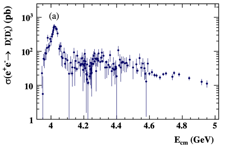 宋维民教授课题组及合作者利用北京谱仪实验获取的世界上最大的粲能区正负电子对撞样本,以前所未有的精度测量了e+e− →Ds+Ds−过程的反应截面,截面的形状揭示了粲夸克偶素的诸多非平庸的新性质,尤其是在能量为4.23 GeV处截面有一个极小值、在能量为4.7 GeV左右截面呈现凸起结构,上述新现象是新粒子、新机制存在的有力证据。