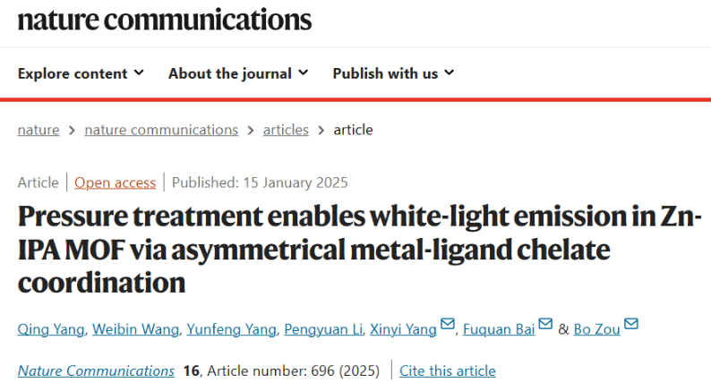 高压与超硬材料全国重点实验室/综合极端条件高压科学中心杨新一教授等人基于压强处理工程调控Zn-IPA金属-有机框架(MOFs)材料的结构刚性和配位构型,实现了Zn-IPA高效荧光/磷光混合型白光发射。相关成果以“Pressure treatment enables white-light emission in Zn-IPA MOF via asymmetrical metal-ligand chelate coordination”为题发表在《Nature Communications》(Nat. Commun. 2025, 16, 696)上。