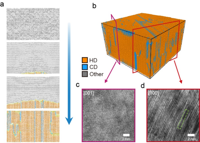图2. 石墨经由后石墨相向六方金刚石结构转变的动力学模拟及其与实验电镜对比照片