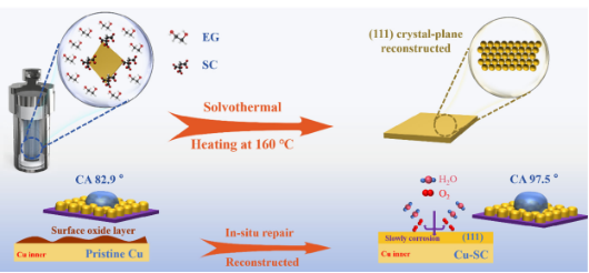 研究团队采用热力学调控的绿色环保工艺体系(溶剂热法),实现了氧化铜箔表面原位修复与Cu(111)晶面重构,成功构筑亚微米尺度的抗氧化层。研究结果表面:(1)基于羟基与半羧基协同还原机制,高效转化表面氧化物为金属铜的原位再生工艺,最大限度契合材料循环再生的经济性最优原则;(2)表面修复工艺处理表面氧化Cu,表面粗糙度显著降低并形成均匀界面结构,有效提升界面疏水性能,构筑物理屏障抑制腐蚀介质向基体渗透,同时通过表面能调控显著增加腐蚀性物种在界面的吸附能垒;(3)溶剂热处理过程诱导Cu基体发生亚微米尺度的深层晶格重组,成功实现(111)晶面的原位构筑,显著提升了Cu对腐蚀介质的抗侵蚀能力,同时协同优化了铜原子的配位环境与电子云分布特征。该抗氧化技术也适用于Cu和Ag纳米材料。