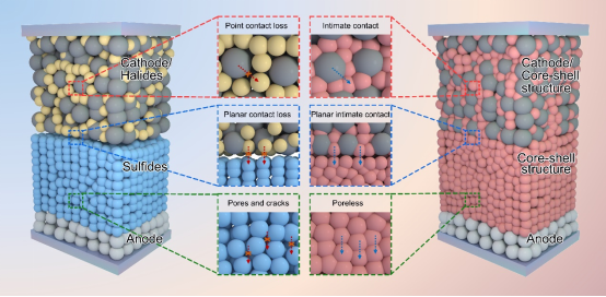 针对上述问题,杜菲教授团队开发设计了NYZC-NPS核壳结构电解质,通过电解质的核壳结构策略,解决了副反应与界面接触失效的问题,实现了高倍率的全固态钠离子电池。本研究首先对核壳结构的组分比例进行调控,分别实现了破碎球壳、薄球壳与厚球壳三种核壳结构。研究团队通过实验分析,确定了薄球壳结构具有最高的离子电导率(0.44mS cm-1)来源于晶界电阻的降低,还实现了致密度(93%)与杨氏模量(9.19GPa)的大幅提升。同时由于卤化物作为壳结构的保护性,实现了>4.0V的电压窗口。研究团队基于上述电解质材料,设计以单一核壳电解质层替代传统三明治结构的多层界面,直接匹配高压NaNi0.33Fe0.33Mn0.33O2正极,有效解决卤化物-硫化物界面接触失效的问题。基于此组装的全固态钠离子电池首圈放电容量达141.8 mAh g-1,首圈库伦效率91.3%,在2.0 C倍率下仍保持76.4 mAh g-1容量,处于目前报道的最高水平,同时循环稳定性较传统设计显著提升,为解决全固态电池界面失效难题提供全新方案。