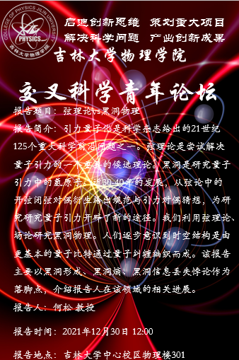 引力量子化是科学杂志给出的21世纪125个重大科学前沿问题之一。弦理论是尝试解决量子引力的一个重要的候选理论。黑洞是研究量子引力中的氢原子。近30-40年的发展,从弦论中的开弦闭弦对偶衍生给出规范与引力对偶猜想,为研究研究量子引力开辟了新的途径。在此基础上,我们利用弦理论、场论研究黑洞物理。人们逐步意识到时空结构是由更基本的量子比特通过量子纠缠编织而成。该报告主要以黑洞形成、黑洞熵、黑洞信息丢失悖论作为落脚点,介绍报告人在该领域的相关进展。