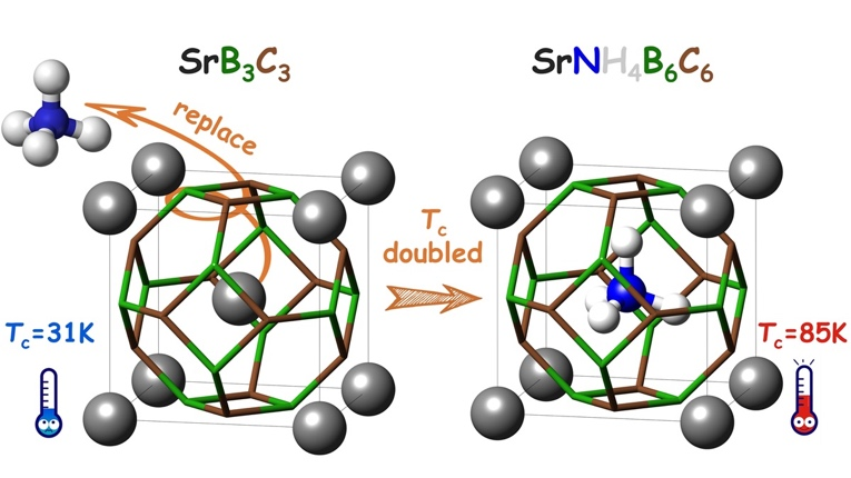 新型高温超导体是凝聚态物理领域的前沿研究热点。近年来,通过理论指导实验,在极端高压条件下发现了一系列富氢的近室温超导体。然而,这些高温超导体难以保留至常压条件下。同时,基于轻元素的sp3键合框架被提出作为实现常压高温超导性的另一种途径。尽管这些材料在常压和较低压强下表现出一定的稳定性,但其超导临界温度(Tc)远低于高压氢基超导体的水平。本报告提出了一种通过将富氢离子单元掺入到硼碳基笼合物结构中来设计实现常压高温超导体的新方法。这一方法基于常压下稳定的硼碳基笼合物超导体,利用氢作为最轻元素的独特优势,进一步提升超导性。例如,掺氨根(NH4+)的SrB3C3可以生成SrNH4B6C6化合物,其常压下的Tc理论值可达85 K,超过其前驱体(31 K)的两倍;同构的PbNH4B6C6的常压Tc理论值则高达115 K,很大程度上超过了液氮温度 (77 K),这对将来实验应用是有利的。本报告为设计实现常压高温超导电性提供了一种具有前景的新思路。