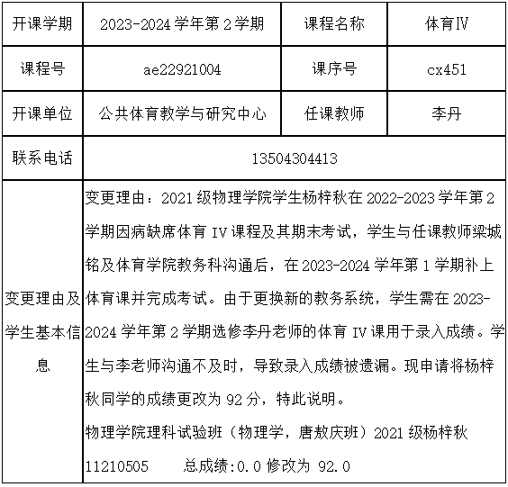 根据《关于进一步明确本科生课程考核等有关问题的通知》(校教字[2018]47号)文件有关精神,现对一下课程成绩更正进行公示: