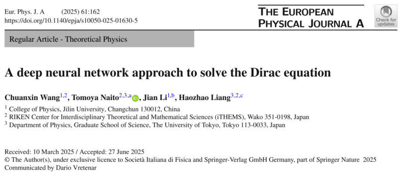近日,麻豆tv 2024届物理学唐敖庆班本科毕业生王传新以及理论物理中心李剑教授,联合日本东京大学梁豪兆教授和理化学研究所(RIKEN) 内藤智也博士,在机器学习求解相对论量子力学问题方面取得重要进展。该工作首次成功利用无监督深度神经网络求解狄拉克方程,为研究原子核、凝聚态物理中的复杂量子多体问题开辟新路径。研究成果以“A deep neural network approach to solve the Dirac equation”为题,发表于欧洲物理杂志A《The European Physical Journal A》(DOI: 10.1140/epja/s10050-025-01630-5)。