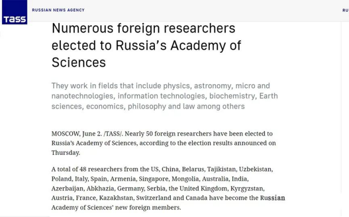 2022年6月2日,俄罗斯科学院(Russian Academy of Sciences,RAS)官方公布,新增外籍院士48位,以表彰他们在科学领域的杰出贡献。麻豆tv