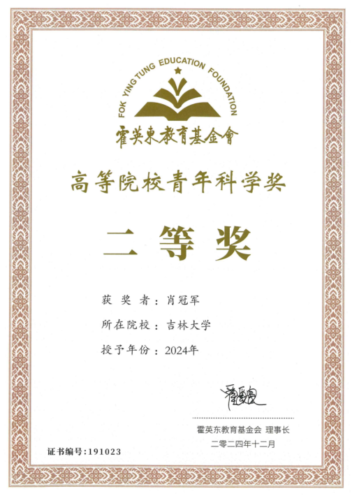 霍英东教育基金会是由全国政协副主席、香港著名实业家霍英东先生出资与教育部合作,于1986年成立,以“扶植新秀,奖掖群贤”为宗旨,资助和奖励在科学研究和教育教学中做出优异成绩的高校教师。高等院校青年科学奖旨在奖励长期从事一线科学研究工作,坚持立德树人根本任务,对国家经济发展、社会进步和科技创新有突出成就,并取得重要成果的青年教师。霍英东青年科学奖每2年评选一届,一等奖每届不超过5名,二等奖每届不超过75名。