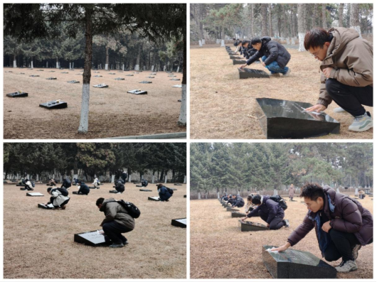 青松肃立,丰碑静默。全体同志怀着崇敬之情来到烈士墓区,细心擦拭每一块墓碑。抹布轻拂,拭去岁月尘埃;指尖触碰,重温先烈荣光。每一次擦拭都是与历史的对话,每一个动作都是对英灵的告慰。最后,众人整装肃立,向烈士深深三鞠躬,以最质朴的仪式表达最深切的缅怀。