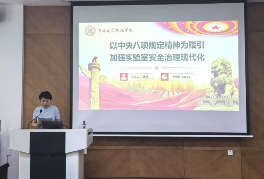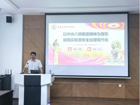 党委书记杨景在物理楼333报告厅以“以中央八项规定精神为指引 加强实验室安全治理现代化”为题,为师生党员代表、安全员讲授了专题党课,学校党建联络员孟文卓列席,会议由党委副书记杨讴菡主持。