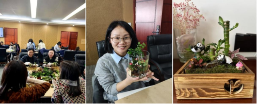 活动伊始,专业园艺教师带来微景观创作教学,从植物特性、搭配技巧到生态养护,深入浅出地讲解设计艺术内涵,为女职工们开启创作灵感之门。DIY 环节,大家化身“生态设计师”,精心挑选植物、苔藓、砂石与卡通摆件,在透明玻璃容器中构建微型生态世界:有人打造“绿野仙踪”,蘑菇屋与小精灵错落其中;有人布置“熊猫之家”,竹子与苔藓相映成趣。现场欢声笑语,大家交流创意、分享心得,方寸之间尽显巧思匠心。