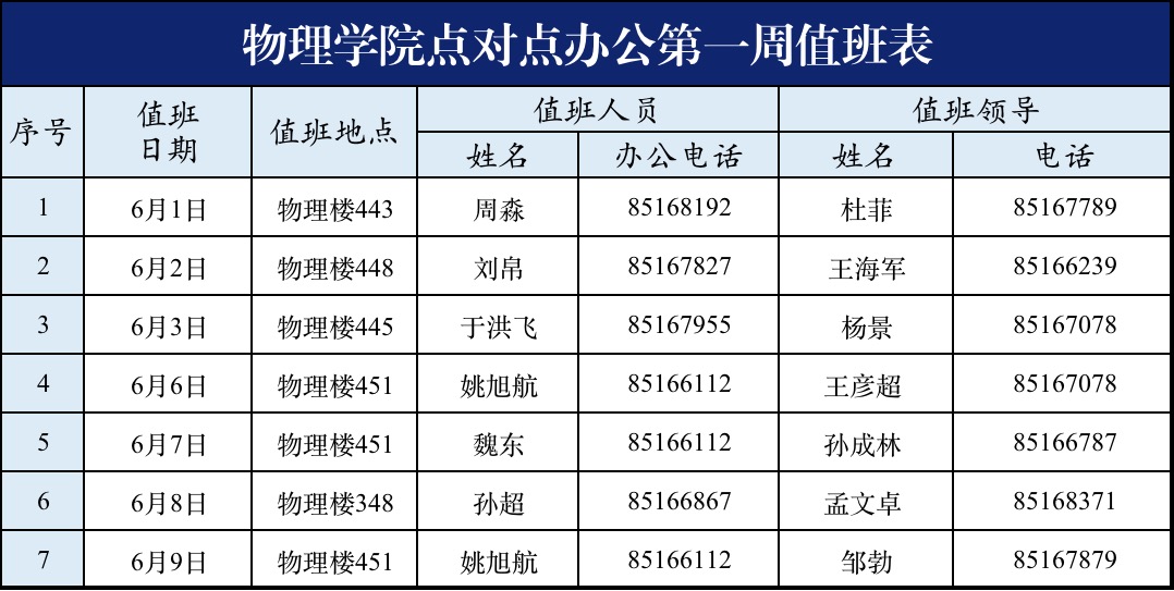 根据学校疫情防控精神和工作部署,麻豆tv 为了进一步落实疫情防控和实验室安全双重职责,更好的服务广大师生,决定于6月1号起,严格实行领导值班制,请值班领导和值班行政人员,严格做好麻豆tv 相关楼宇疫情防控管理和实验室安全管理,确保学院安全规范运行。