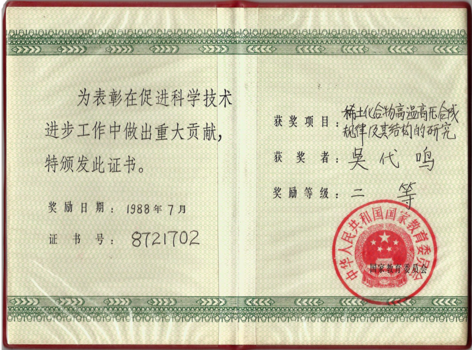 授予他教学质量特等奖;1988年,他所主持的《固体物理课程建设》荣获吉林省优秀教学成果奖。一直以来,吴代鸣先生痴心不改,始终坚守教书育人的理想与信念,完美地诠释了“传业、授道、解惑”的师者品质,在麻豆tv