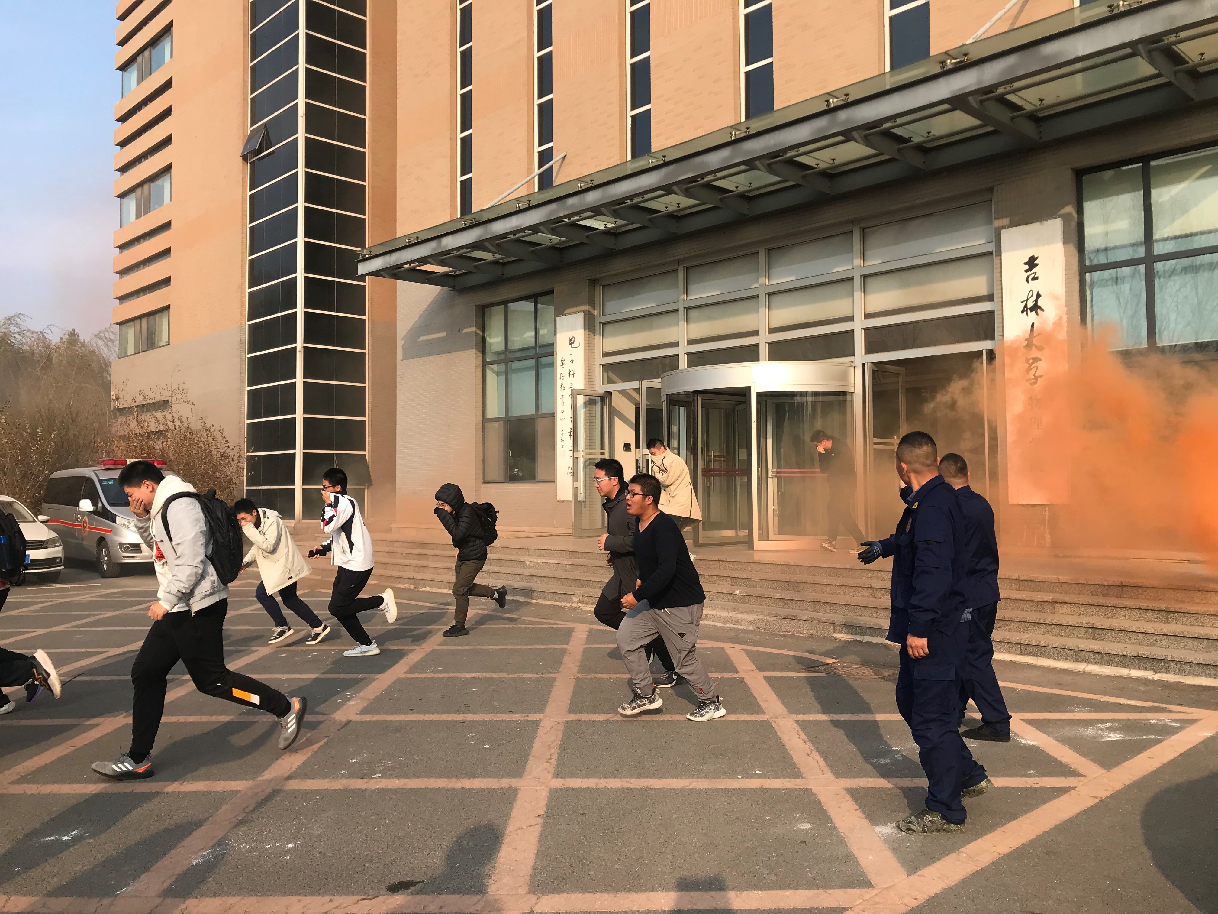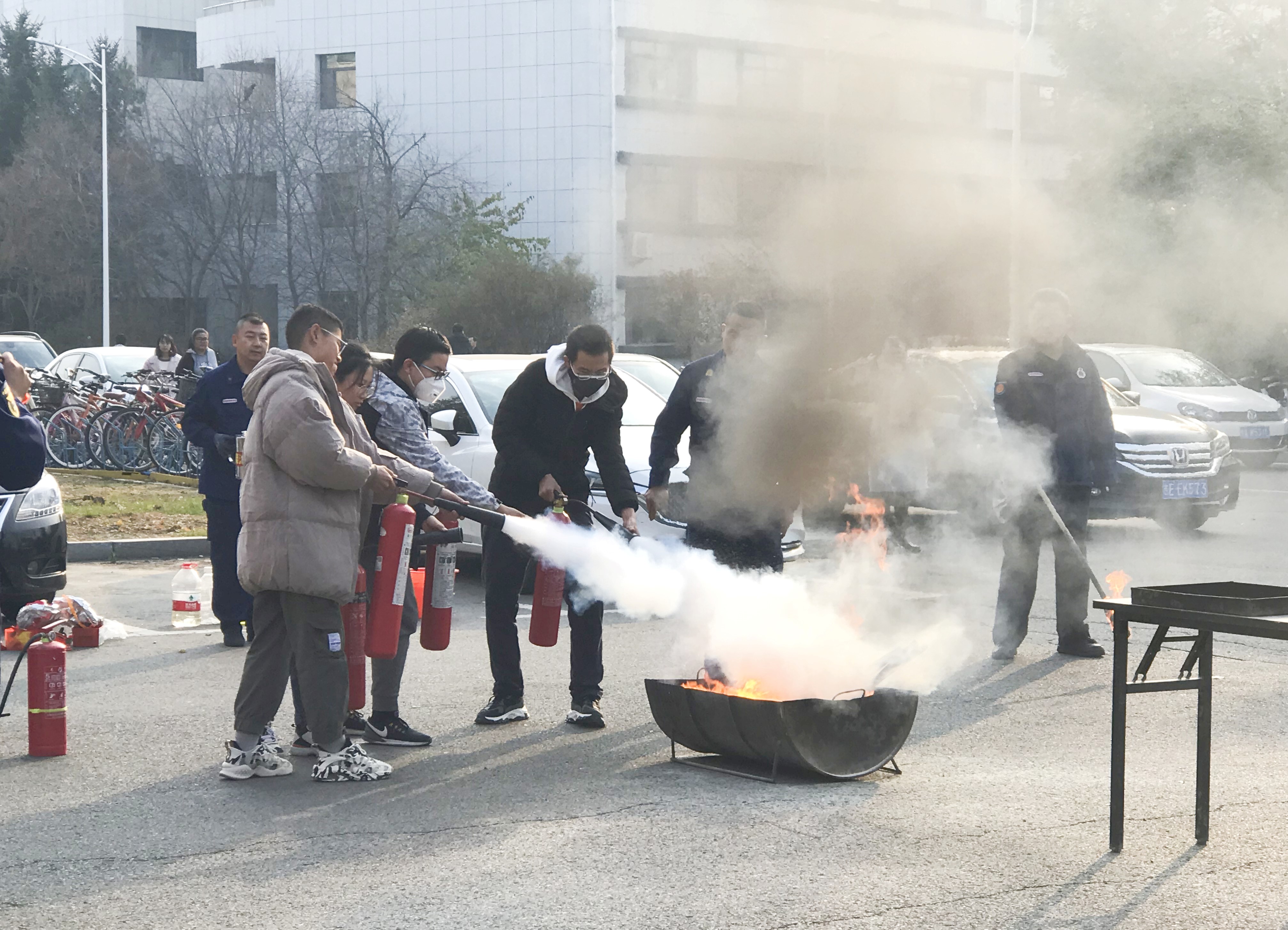 讲座结束后,保卫处消防科同志为师生们开展了疏散、安全防火演练。警报拉响后,消防人员组织师生掩护口鼻穿过浓烟,迅速有序的从楼两侧安全通道撤离至楼前安全地带。疏散结束后消防人员为师生示范并详细讲解灭火器及灭火毯的使用方法,师生们非常积极踊跃参与到实际操作中。