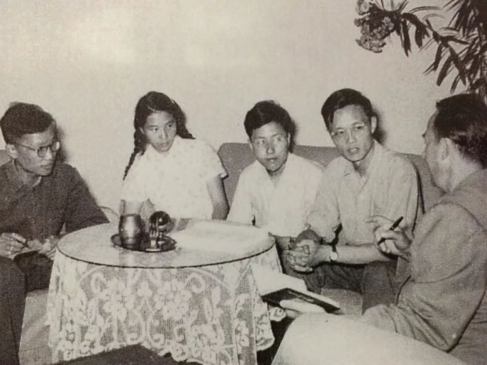 1958年,宋家树(右二)、王佩璇(左二)等研究生与莫洛佐夫(右一)