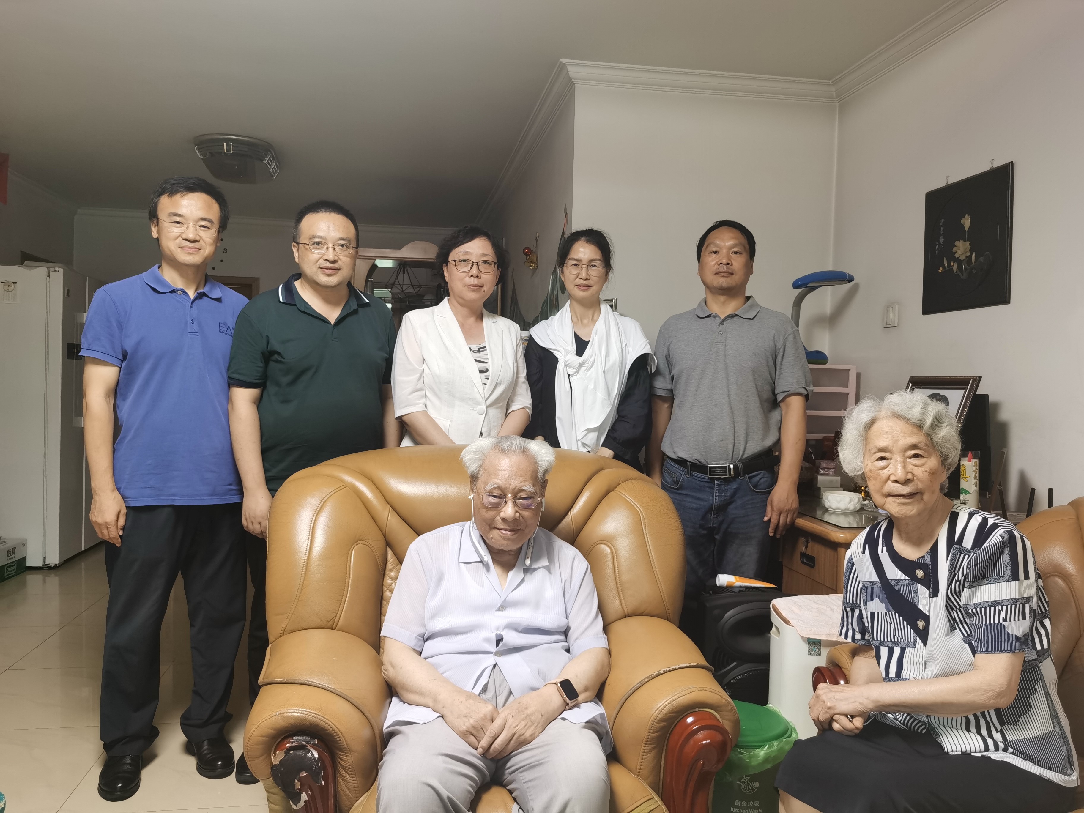 在宋家树院士家里,前排为宋家树、王佩璇夫妇,后排左起为李兆辉(93级)、姚伟(87级)、孟文卓、杨景