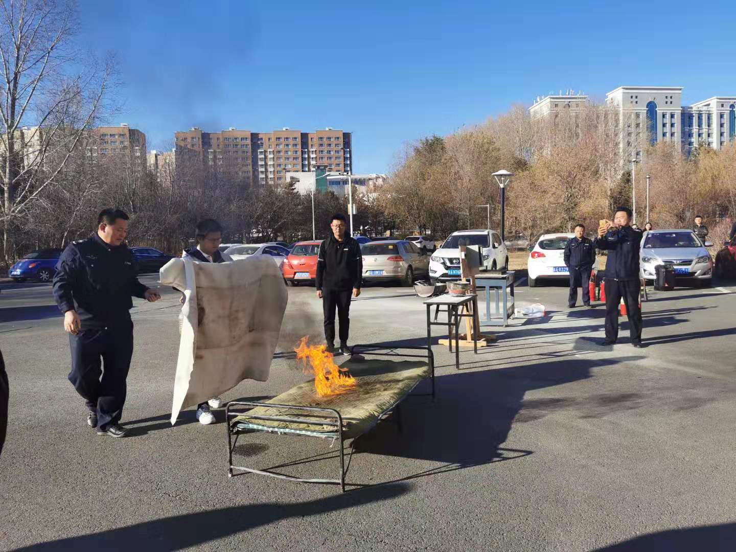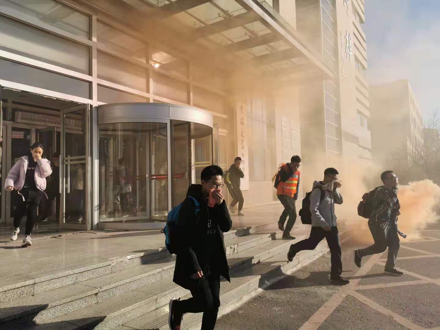 讲座结束后,随即展开了安全防火演练,警报拉响后,疏散组人员立即组织师生掩护口鼻穿过浓烟,迅速有序的从楼两侧安全通道撤离至楼前安全地带。疏散结束后董老师为师生示范并详细讲解灭火器及灭火毯的使用方法,同学们也积极踊跃参与实际操作,掌握了正确的灭火方法。