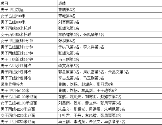 45名教职工参加本次运动会,报名参与了32个竞赛项目,团体总分排全校第六名,前五名分别为白求恩第三临床医学院、白求恩第一临床医学院、白求恩第二临床医学院、校部机关代表队、附属学校代表队,在教学科研单位中排名第一。