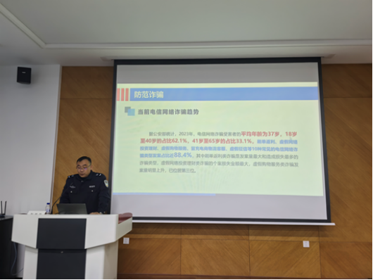 保卫处治安科卢阳老师首先围绕当前电信网络诈骗的发展趋势,系统讲解了帮助信息网络犯罪活动罪的定义、常见形式与相关案例,普及了《刑法》与《反电信网络诈骗法》中的关键内容。他结合近年来在高校中多发的“刷单返利”“游戏充值”“邮件诈骗”及“虚拟绑架诈骗”等真实案例,以生动易懂的语言揭示了诈骗分子的作案手段、话术陷阱与最新套路。针对大学生社会经验尚浅、防范意识不足的特点,卢阳老师特别强调了“三不一多”原则——未知链接不点击、陌生来电不轻信、个人信息不透露、转账汇款多核实,并鼓励大家积极运用科技手段增强自身反诈能力。