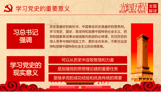 正如张跃宁同学的演示文稿中提到的,习近平总书记强调过,历史是最好的教科书,中国革命历史是最好的营养剂。学习党史、国史,是坚持和发展中国特色社会主义、把党和国家各项事业继续推向前进的必修课。在对历史的深入思考中做好现实工作,更好走向未来,不断交出坚持和发展中国特色社会主义的合格答卷。我们学习党史,是从历史中汲取智慧和力量,是加强党的思想理论建设的重要任务,是继承党的成功经验和优良传统的需要。