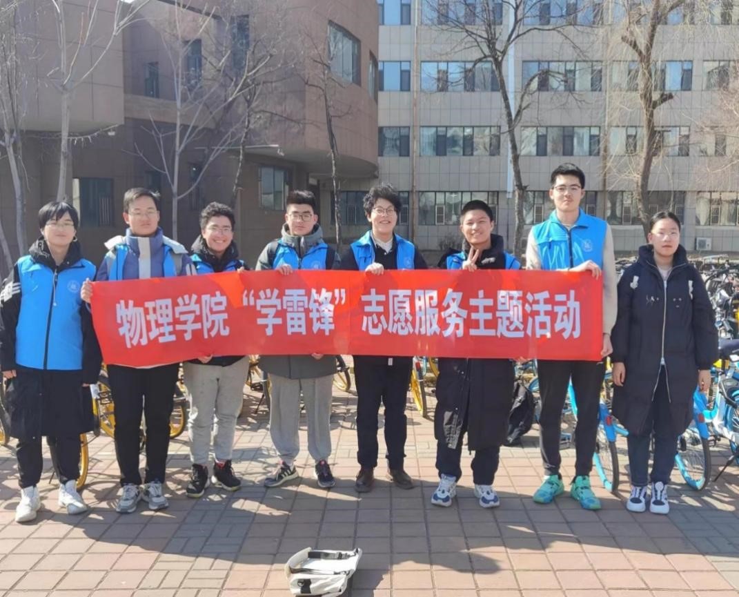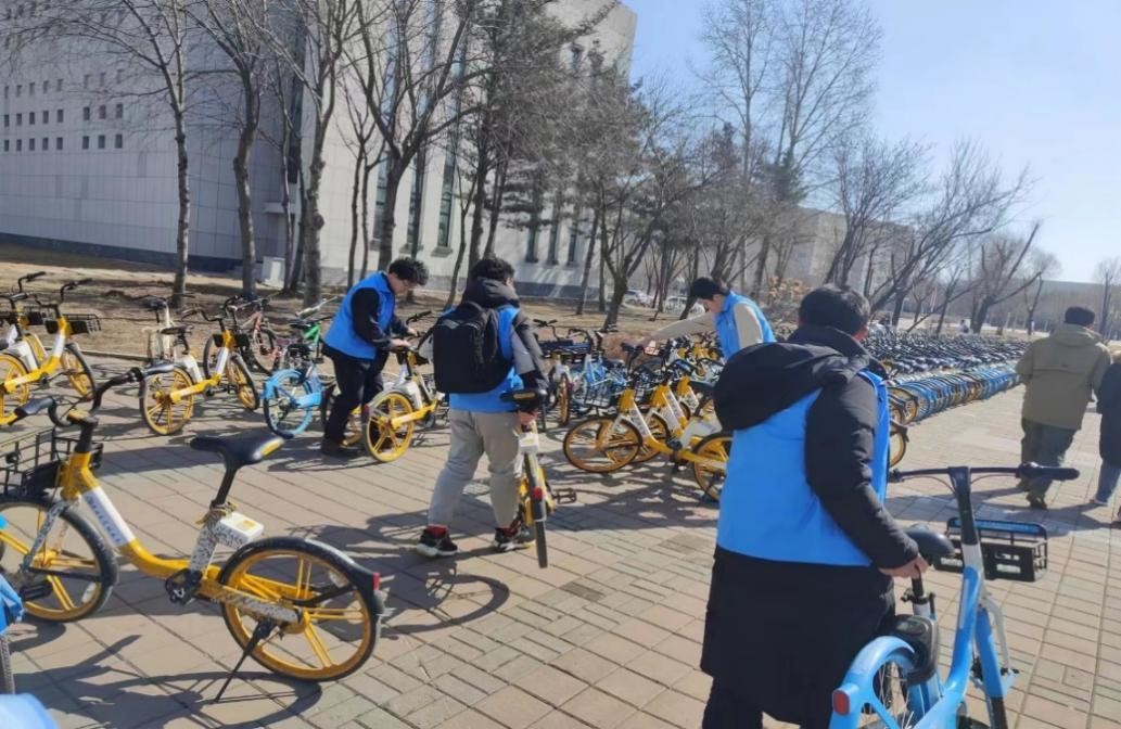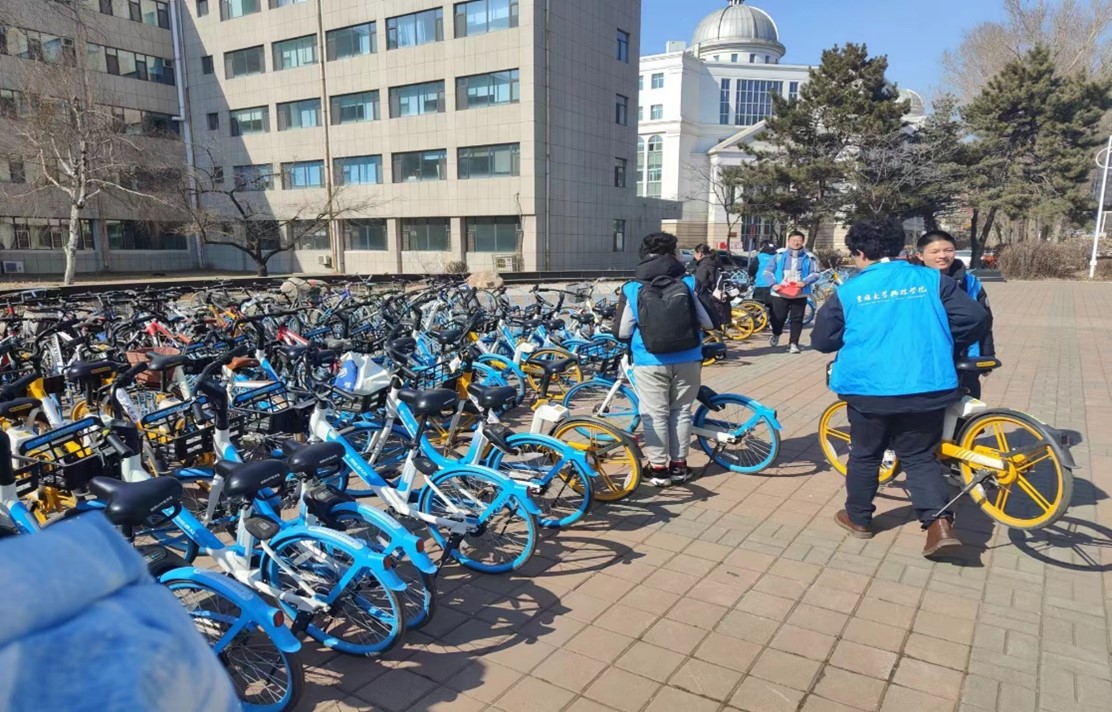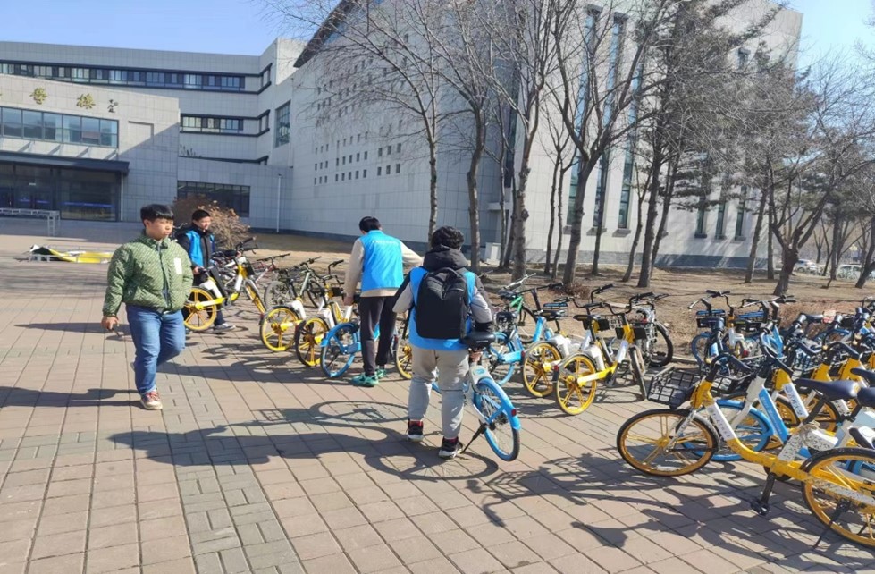 2022级6班团支部组织学生开展“学雷锋”志愿活动,在逸夫教学楼前将共享单车摆放整齐、清洁楼前卫生。