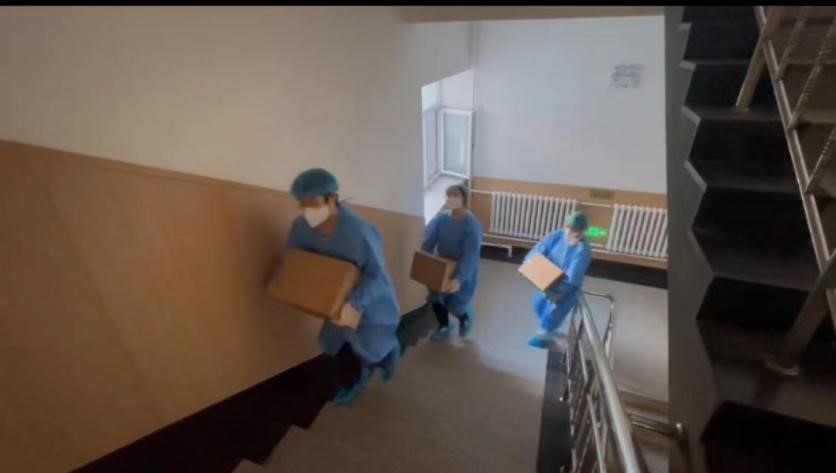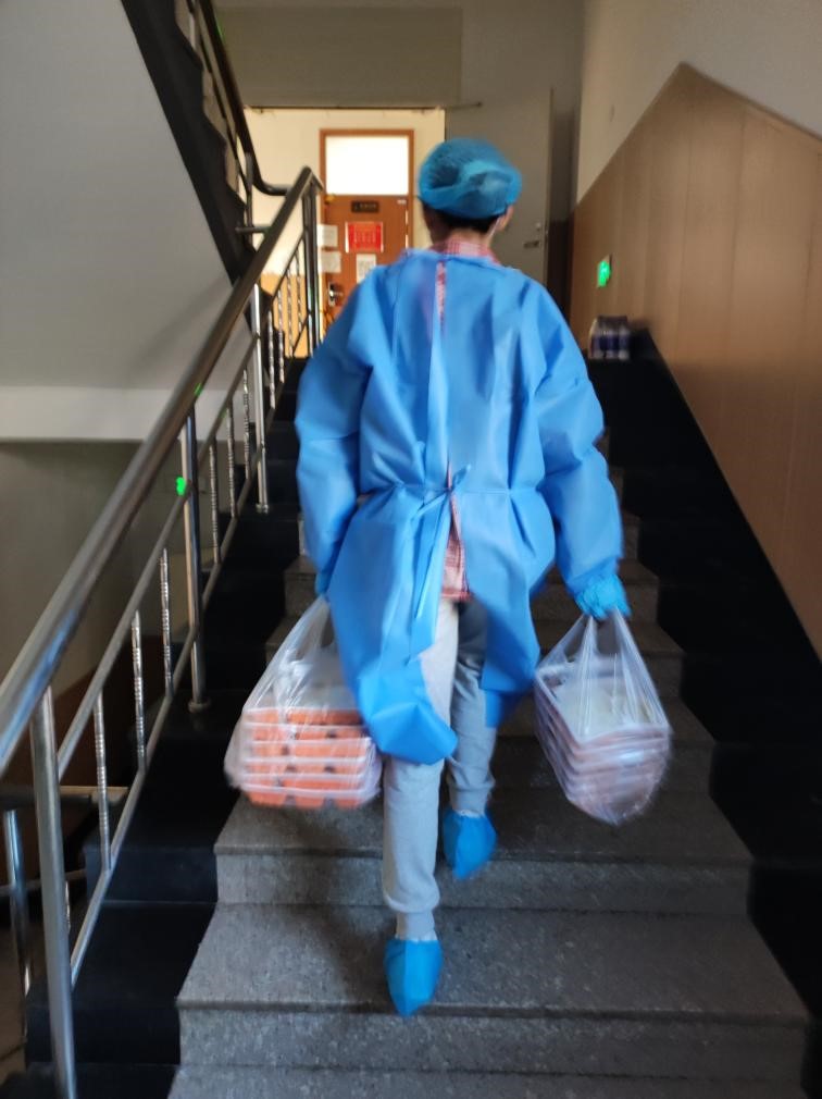 早晨六点,一声闹铃,标志着志愿者的一天从此刻开始,穿好防护服,在每个门前悄悄放下餐盒和牛奶。中午和晚上,志愿者们需要提前一个半小时左右去搬发餐食。纵向志愿者主要负责把寝室外的餐箱放到小推车上,推到宿舍里面,并且再把餐盒、酸奶、水果等物资分发到各层。横向志愿者负责把饭准确分发到每一个寝室。虽然做志愿者很累,但是大家依然选择站出来,做给大家提供便利的人。