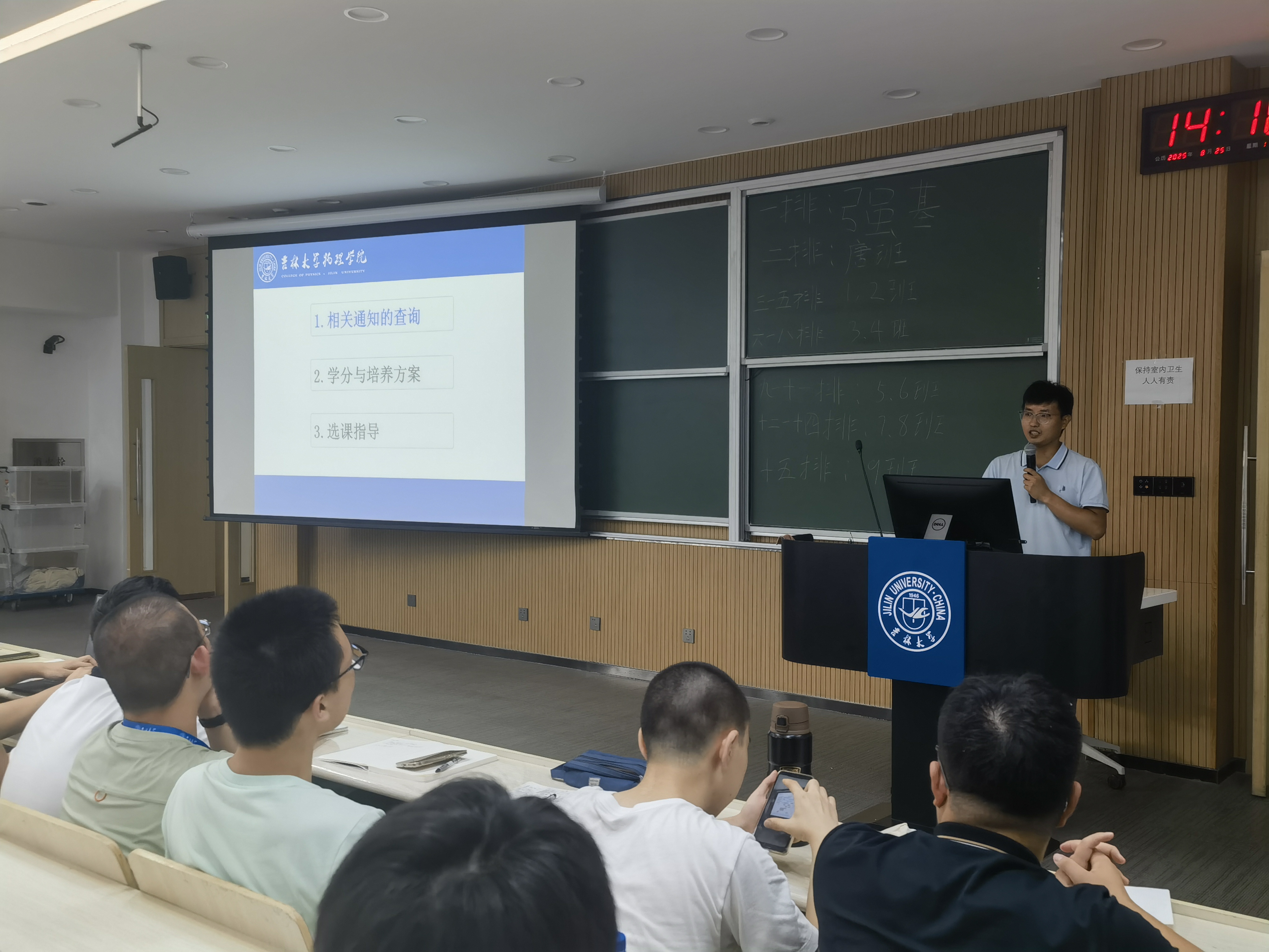 随后,梁军请老师为大家介绍了通知查询的常用网址,详细讲解了学业关键信息,并重点强调选课要注意时间节点,还贴心地公布了办公室电话,方便新生咨询学业问题。